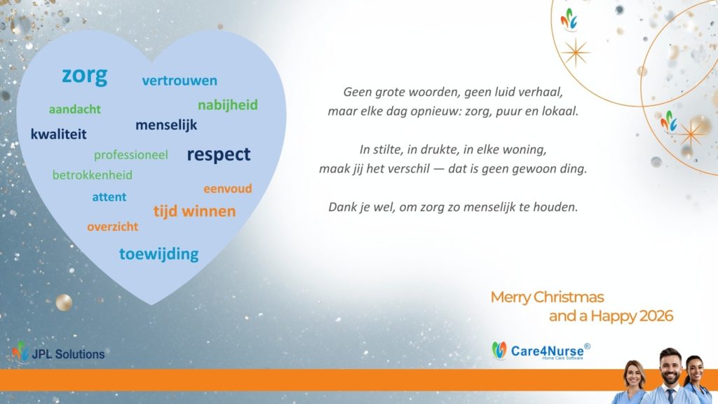 Care4Nurse is een slimme en gebruiksvriendelijke software die thuisverpleegkundigen helpt hun praktijk efficiënt te beheren en hun patiënten de beste zorg te bieden. De software wordt ontwikkeld door JPL Solutions BV, een stabiel en betrouwbaar bedrijf met meer dan 20 jaar ervaring in de sector.
